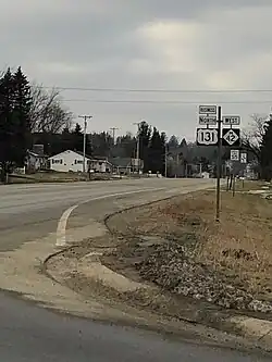 M-42 is a rural, two-lane highway connecting Manton and Lake City.[3] It runs through wooded terrain on gently rolling hills. Between the western terminus at Michigan Avenue and the US Highway 131 (US 131) freeway in Manton, M-42 runs concurrently Bus. US 131 along Seventh Street. It runs east along Seventh Street to a folded diamond interchange at exit 191 on US 131 east of downtown. Continuing east, it is known as North 16+1⁄2 Road until it crosses the Wexford–Missaukee county line at Seeley Road approximately 2.5 miles (4.0 km) east of the freeway. Here the road name changes to Mike and Tony Road before M-42 curves southeasterly crossing Morrisy Creek on West Walker Road. East of the unincorporated community of Arlene the highway turns ninety degrees to the south off Walker Road before angling southeasterly skirting the edge of some hills near Dyer Lake just west of M-66. The road turns back due east between Al Moses Road and M-66, where it ends north of Lake City.[4] No section of the trunkline is part of the National Highway System.[5]