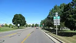 M-66 is a four-lane highway that connects with State Road 9 (SR 9) at the Indiana state line in southern St. Joseph County. The highway runs north to Sturgis through farm land where it turns east through town running concurrently with US 12 on Chicago Road.[6] As it leaves Sturgis to the north it crosses a branch of the Michigan Southern Railroad,[7] and it becomes a two-lane surface highway along Nottawa Street. The highway runs near several small lakes and crosses the Prairie River before meeting M-86. The two highways run north–south concurrently for about 1.9 miles (3.1 km) along the Nottawa–Colon township line. Farther north, M-66 crosses the St. Joseph River and meets M-60. M-60/M-66 run together to the east, crossing Nottawa Creek, then turning northeasterly in Leonidas and crossing into the northwest corner of Branch County. M-60 and M-66 separate west of Union City, and M-66 turns north into Calhoun County.[6][8]