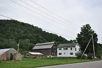 The Whitcomb Farm property is located about 1.5 miles (2.4 km) east of the village center of Richmond, on a roughly triangular parcel that abuts Interstate 89 to the south and is divided by US 2. The area south of US 2 is mainly bottomlands of the Winooski River, and have traditionally been used for crops, while the area north of that road is hillier, and has traditionally been used as pastureland. The farmstead complex is set on the north side of US 2, and is roughly centered on the farm's road frontage. The complex's most prominent feature, visible from the interstate, is a large three-story bank barn with a monitor roof. At the western end of the farmstead is a 2-1/2 story wood frame farmhouse with Italianate appearance; it is a reconstruction (using some surviving elements) of an 1875 building that burned down in 1982. To the right of the bank barn is a round-roofed metal storage barn built about 1975.[2]