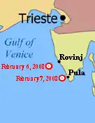 The ship remained 5 mi off Pula until 17 February, when Italian tugboats began pulling it towards Trieste. Reportedly, the Norwegian classification organisation Det Norske Veritas confirmed all security measures were in place to allow that.[13] On 19 February it arrived in Trieste.[14]