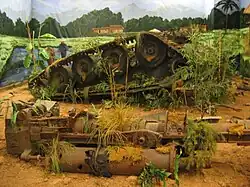Diorama of destroyed M56 at the AAF Tank Museum. Note the prominent rubber tires on the road wheels.