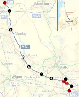 3. ^ "Junction 14" refers only to the M60 link road. The M61 mainline has no junction number, although some sources have claimed it was junction 1. Before the M60 was created, it was M62 junction 14A.