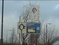 Despite the M63 being renumbered in 1998 to M60, many roadsigns still existed pointing travellers to the M63 until late 2005. One existed on the roundabout Redclyffe Circle near the Trafford Centre stating "Stockport M63, Carrington", but this was replaced with an M60 sign in the period 2012–2014.[3] There were also two signs on Manchester Road, Wilmslow, one of which was still in place in October 2021.[4][5] Another sign could be found on Trafford Road, Salford Quays across the road from Exchange Quay. However, one sign has been recently removed. Located at the roundabout joining Alderley Road in Wilmslow, the sign was still in place in June 2016,[6] but it has since been removed.