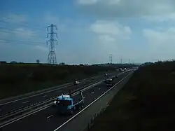 According to the statutory instrument that authorised its construction, the road is officially classified as a 'special link road to connect the [M65/M61 roundabout] with the all-purpose road known as Tramway Lane'.[7] According to Lancashire County Council, it is the 'M61 Link Tramway Lane to Junction 9' and is part of the M61.[8] In 2007, the approach signs from Walton Summit were modified to read 'M61', but the signs still mark the roundabout at the eastern end.