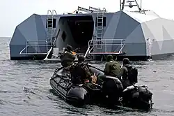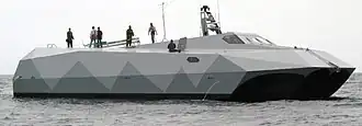 The M80 Stiletto is a U.S. Navy vessel designed for combat in shallow coastal waters. The 88-foot (27 m) Stiletto's unusual shape and patented M-hull provides a stable yet fast platform for mounting electronic surveillance equipment or weapons, or for conducting special operations. The hull design allows stability at high speeds and rough conditions without the need for foils or lifting devices.