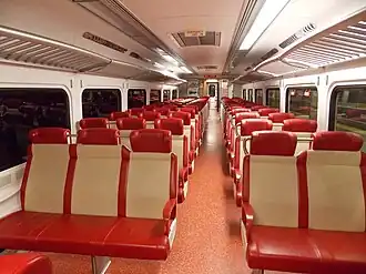 The M8s have new roomier, high-back seats with individual headrests and curved arm rests for more comfort.[3] For improved safety, especially in the vestibules, the cars have larger windows and better lighting. An additional safety feature is the installation of intercom systems that customers can use to contact the train crew in case of emergency. Other features included curved luggage racks, coat hooks, electrical outlets to charge personal devices, and LED displays that show that next stop and automated announcements. The cars also have external public address speakers, and electronic destination signs. Higher reliability is possible with single leaf doors, which also lessen the susceptibility to snow intrusion.[10] Also, the M8s have sealed alternating current motors that are less susceptible to weather.[14]