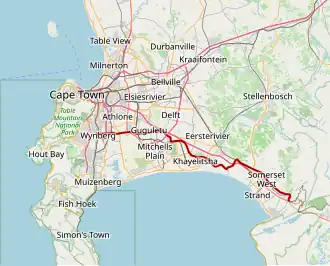 The M9 is a long metropolitan route in the City of Cape Town, South Africa.[2][3] It connects Sir Lowry's Pass Village with Wynberg via Somerset West, Firgrove, Macassar, Khayelitsha and Nyanga.[4][5]