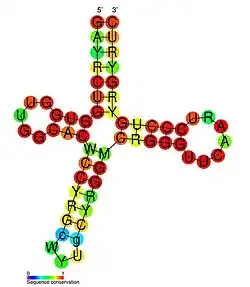 MALAT1-associated small cytoplasmic RNA, also known as mascRNA, is a non-coding RNA found in the cytosol. This is a small RNA, roughly 53–61 nucleotides in length, that is processed from a much longer ncRNA called MALAT1 by an enzyme called RNase P.[1] This RNA is expressed in many different human tissues, is highly conserved by evolution and shares a remarkable similarity to tRNA which is also produced by RNase P, yet this RNA is not aminoacylated in HeLa cells. The primary transcript, MALAT1 (metastasis associated lung adenocarcinoma transcript 1), appears to be upregulated in several malignant cancers.[2] Another small RNA that is homologous to mascRNA, called menRNA, is processed from another long ncRNA called MEN beta.[3]