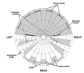 There are six opening vents at the front of the canopy improving stability and the integrity of the canopy by allowing the increased air volume, due to the increased forward speed, to pass through instead of collapsing the front of the canopy during descent. The improved forward movement is provided by three drive vents at the rear of the canopy and mesh netting is sewn into these vents. A brake slot reduces forward drive and allows for the canopy to be maneuvered backwards. Control line toggles on the risers are attached to the lower control lines which reach the extended gores via attachment to the middle then upper control lines.[4]
