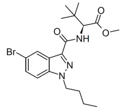 MDMB-5'Br-BUTINACA (5'-Br-MDMB-BUTINACA) is an indazole-3-carboxamide based synthetic cannabinoid receptor agonist that has been sold as a designer drug. It was first identified in Russia in August 2022. It is believed to be synthesized from the "half finished" synthesis precursor MDMB-5Br-INACA, which is shipped to the destination and then the final synthetic step is completed on arrival.[1][2][3]