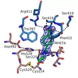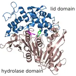 The structure of MHETase was solved in 2019.[3] It shows the common fold of the alpha/beta hydrolase superfamily. According to the classification in the ESTHER database, MHETase belongs to the family of tannases within block X.[4] This family mainly contains tannases und feruloyl esterases. The enzyme consists of two domains: the hydrolase domain harbors the catalytic residues Ser225, His528 and Asp492; the lid domain contributes most of the residues of the substrate binding site.