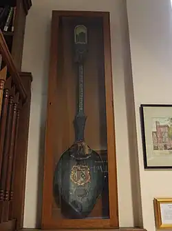 The last wooden spoon was awarded to Cuthbert Lempriere Holthouse, an oarsman of the Lady Margaret Boat Club of St John's College, Cambridge, in 1909 at the graduation ceremony in the university's Senate House. The handle is shaped like an oar and inscribed with an epigram in Greek which may be translated as follows: