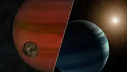 MOA-2011-BLG-262L is a red dwarf with an orbiting exoplanet, both detected through the gravitational microlensing event MOA-2011-BLG-262.[3] It was once believed to be either an exoplanet with 3.2 times the mass of Jupiter and a exomoon with 0.47 times Earth's mass or a red dwarf with a mass of 0.11 solar masses orbited by a ~17 M🜨 planet,[2][4] but the latter scenario was confirmed in 2024 based on observations of the host star by the Keck telescope, 10 years after the ending of the microlensing event.[3]