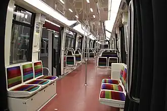 The RATP opted for an interior also similar to that of the MP 89, with only the colors differing: the blue and gray tones replaced by an off-white tone, the floor colored brick red, and the seats with a rainbow pattern, in a design was conceived by Yo Kaminagai.