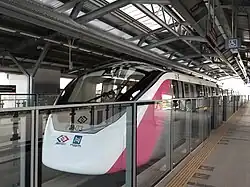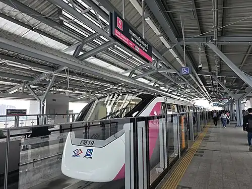 The MRT Pink Line (Thai: รถไฟฟ้ามหานคร สายสีชมพู) is an elevated monorail line of the MRT in Bangkok and Nonthaburi Province, Thailand. The monorail line is 34.5 kilometres (21.4 mi) long and has 30 stations.[3] It runs in the northern part of the Bangkok Metropolitan Area from Nonthaburi Civic Center in Pak Kret district, Nonthaburi along the major east–west transport corridor of Highway 304 (Chaeng Wattana and Ram Inthra roads) to terminate at Min Buri in Min Buri district in east Bangkok. It opened for free public trial operation on 21 November 2023[4] with then Prime Minister Srettha Thavisin taking the inaugural ride.[5]