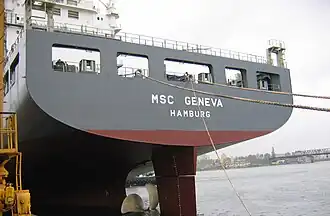 MSC Geneva is a container ship built in 2006 by the Daewoo Mangalia Heavy Industries in Mangalia, Romania and currently operated by Mediterranean Shipping Company S.A. She is the first ship delivered to the Swiss company in a series of 12 ordered.[1] The 54,549 DWT ship has a container capacity of 4,860 TEU.