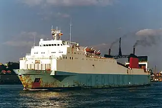 In October 1988, under charter to DFDS Seaways,[3] Trapezitza and her sister, which had been renamed Tzarvetz, were purchased by Sealink British Ferries[3][6] and renamed initially to Fantasia and Fiesta respectively. After a short refit in Bremerhaven in 1989 Fantasia was again renamed Channel Seaway and began operating a freight service between Dover and Calais. Sealink eventually decided to use the two vessels, in a pooling agreement with SNCF to provide a joint service running between Dover and Calais.[6] As a result of this decision, Channel Seaway and her sister, now named Fiesta were sent to Lloyd Werft, Bremerhaven in October 1989 to be converted from freight carriers to passenger carriers.[3] As part of the pooling agreement, Channel Seaway was to be given to SNCF. As a result of this, whilst at Bremerhaven, the two vessels swapped names, Channel Seaway becoming Fiesta.[6] Fiesta returned to Calais on 13 May 1990, however due to French industrial action, did not enter service until 9 July 1990.[6] In 1989 ownership of the vessel transferred to Societé Nouvelle d'Armement Transmanche (SNAT)[7] and then in 1990, SNCF transferred the operations to Societé Propietaire des Navaires (SPN).[7] In August 1990, SPN and Sealink British Ferries signed a five-year extension to their pooling agreement on board Fiesta in Dover harbour.[6] The early 1990s was a difficult time for Fiesta, her services frequently being interrupted by industrial action, most notably in June/July 1991, April 1992 and February 1995.[6]