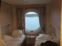 - A cabin with a window, for four people. Two bunk beds with two levels each. Floor surface 9.4 to 9.7 m2.
