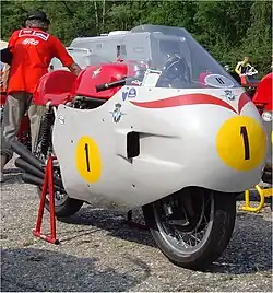 Before the start of the 1955 season, Count Agusta contracted the young rider Ray Amm, winner of the Senior TT of 1954. Amm, however, would never ride a Grand Prix for MV Agusta. At Easter the team rode the Coppa d'Oro Shell Race at the Imola Circuit. In pursuit of Ken Kavanagh on a Moto Guzzi, Ray Amm lost control of his MV Agusta 350 4C at the Rivazza corner. He crashed on the slippery track and died in hospital from his injuries.[18] Umberto Masetti came over from Gilera to support Carlo Bandirola. In Spain Bandirola came second and Masetti third.[19] Masetti won the last race of the season at Monza.[20]