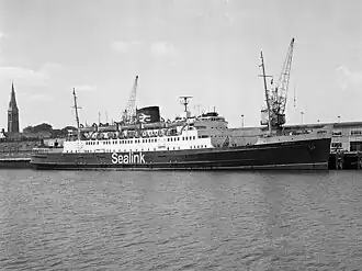 MV Cambria was a twin screw motor vessel operated by the British Transport Commission from 1948 to 1962 and British Rail from 1962 to 1976.[2] Together with her sister ship the MV Hibernia she served the Holyhead to Dún Laoghaire route across the Irish Sea.[3]