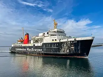 MV Isle of Arran (Scottish Gaelic: Eilean Arainn) is a drive-through ferry operated on the west coast of Scotland by Caledonian MacBrayne. Also known by her local nicknames IOA and The Auld Trooper, she entered service in 1984 on the Ardrossan to Brodick route, serving Arran for nine years before being moved to Kennacraig. She returned to her original route in 2012, supplementing MV Caledonian Isles in summer and becoming a relief vessel for Arran in winter as well as other routes where required. In 2013, she started a new pilot route from Ardrossan to Campbeltown, which became a permanent fixture in 2015. As of 2023, she is one of the oldest vessels in the fleet, having been in service for 40 years; upon arriving into Oban in the West Highlands, celebrations were mounted ashore to mark the 40th anniversary of her launch and service on 2 December 2023.