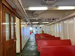 Of drive-through design, Isle of Arran has an open plan car deck with space for 76 cars in five lanes. She is fitted with a bow visor and bow and stern ramps. The open stern allows her to carry tankers and other large vehicles at the same time as passengers. There is insufficient height for lorries and coaches down either side of the car deck due to a gallery deck. From the car deck one must go outside to access the passenger accommodation. On Deck 3 is a sheltered seating area, access to the car deck and passenger lounges, and a luggage area.