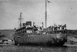 While sailing as a troopship, the Llangibby Castle was torpedoed on 16 January 1942 by the German submarine U-402, under the command of Siegfried von Forstner, during U-402's second patrol in the Bay of Biscay. The torpedo hit the Llangibby Castle's stern, killing 26 people and blowing away her after gun and the rudder.[5] Her engines were still operational and she was able to limp to Horta, in the Azores, steering with her engines, and only making 9 knots (17 km/h).[5][6] During the voyage she had to fight off attacks from German Focke-Wulf Fw 200 "Condor" long range patrol bombers. She arrived safely at Horta on 19 January, but could only stop for 14 days as Portugal was a neutral country. After making some repairs she prepared to sail again for Gibraltar on 2 February, escorted by the destroyers HMS Croome, HMS Westcott and HMS Exmoor, and towed by the tugboat Thames.[5] The convoy was followed by several U-boats, but escaped damage, with Westcott sinking U-581.[5] The small convoy arrived at Gibraltar on 8 February, where the troops were disembarked, and some temporary repairs carried out.[7] Llangibby Castle sailed for Britain on 6 April, still lacking a rudder. She arrived in Britain on 13 April, having sailed 3400 miles with a damaged stern and steering by engines, an achievement which led to her master, a man named Bayer, being awarded the OBE.[4]