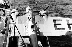 In the Spanish Civil War Monte Pascoal repatriated 226 German volunteers from Sevilla back to Hamburg in June 1937.[6] In January 1939, a Luftwaffe Heinkel He 115 aircraft, registration D-AEHF, suffered an engine failure over the Atlantic Ocean. The aircraft landed alongside Monte Pascoal, which rescued the crew and lifted the aircraft from the water using a derrick at the bow of the ship.[7]