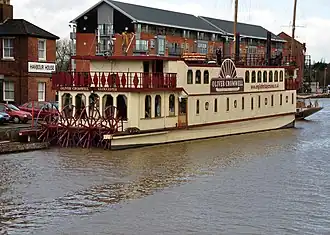 MV Oliver Cromwell was a Mississippi-style riverboat which was constructed as a Dutch barge in 1922 and converted into a riverboat hotel in 1993. As a stern paddle steamer and served as a hotel, restaurant and cabaret venue at Gloucester Docks, Gloucester. The vessel sank in the Irish Sea about 12 miles (10 nmi) west of South Stack, Anglesey on 25 March 2018 whilst being towed to a new location in Coleraine, Northern Ireland.[4]
