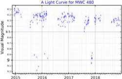 - ^ a b c d e f Grady, C. A.; Hamaguchi, K.; Schneider, G.; Stecklum, B.; Woodgate, B. E.; McCleary, J. E.; Williger, G. M.; Sitko, M. L.; Ménard, F.; Henning, Th.; Brittain, S.; Troutmann, M.; Donehew, B.; Hines, D.; Wisniewski, J. P.; Lynch, D. K.; Russell, R. W.; Rudy, R. J.; Day, A. N.; Shenoy, A.; Wilner, D.; Silverstone, M.; Bouret, J.-C.; Meusinger, H.; Clampin, M.; Kim, S.; Petre, R.; Sahu, M.; Endres, M.; Collins, K. A. (2010). "Locating the Accretion Footprint on a Herbig Ae Star: MWC 480". The Astrophysical Journal. 719 (2): 1565–1581. Bibcode:2010ApJ...719.1565G. doi:10.1088/0004-637X/719/2/1565. hdl:2060/20110023025.