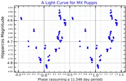 MX Puppis (MX Pup) is a class B1.5IV[3] (blue subgiant) star in the constellation Puppis. Its apparent magnitude varies irregularly between magnitude 4.6 and 4.9 and it is classified as a Gamma Cassiopeiae variable.[2] It is approximately 930 light years away based on parallax.[1]