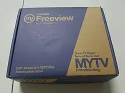 MYTV Broadcasting Sdn Bhd (MYTV) is a Malaysian television broadcasting company based in Cyberjaya, Selangor. It provides free digital terrestrial television (DTT) in the country, considered first of its kind.[1] The DTT service is officially branded as myFreeview since August 2015, though the legal name of the company remained unchanged.[2] A billion MYR deal has been signed with Telekom Malaysia to distribute the services.[3][4][5][6][7][8][9][10]
