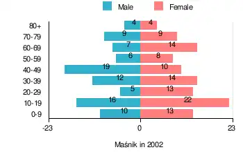 (by age group in 2002)TOTAL 0-9 10-19 20-29 30-39 40-49 50-59 60-69 70-79 80 + I. TOTAL person 195 23 38 18 26 29 14 21 18 8 — of which in % 100 11.8 19.5 9.2 13.3 14.9 7.2 10.8 9.2 4.1 1. BY SEX A. Males person 88 10 16 5 12 19 6 7 9 4 — of which in % 45.1 5.1 8.2 2.6 6.2 9.7 3.1 3.6 4.6 2.1 B. Females person 107 13 22 13 14 10 8 14 9 4 — of which in % 54.9 6.7 11.3 6.7 7.2 5.1 4.1 7.2 4.6 2.1