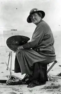 Later, she became known for her summer beach scenes along the New England shore.[9] She painted many beach scenes and airy landscapes focusing on the play of light and shadow.[9] These scenes often depicted families and children enjoying fine weather at the beach.[11]
