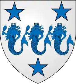 The coat of arms pictured is that of Dermot MacAuliffe and was first registered in the early 18th century. MacAuliffe was at the time considered the chief of the sept.[15] The arms are blazoned argent three mermaids with combs and mirrors in fess azure between as many mullets of the last; crest a boar's head couped or.[note 2] MacAuliffe was an officer in the Spanish Army.[15] On 1 November 1709, the King of Spain combined several Irish units in his service, one of which, the Ultonia Regiment, was commanded by MacAuliffe. In 1715, MacAuliffe was succeeded by Tadeo (Tadhg) MacAuliffe, who was later mortally wounded in 1718. Tadeo MacAuliffe was then succeeded by Michael MacAuliffee, who was later killed in battle in 1720.[17]