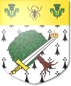 | Arms | Ermine an oak tree eradicated in bend dexter surmounted by a sword in bend sinister Proper hilt and pommel Or supporting on its point an imperial crown of the second on a chief of the third a spider Sable between two thistles also Proper. |