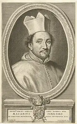 Jean-Baptiste Simeomo was born in Antwerp in 1616 to Marc-Aurelio Simeomo and Sara de la Chambre and was baptised in Antwerp Cathedral on 13 May of that year.[1] His father was an Italian merchant in the city. He was educated at the Jesuit college in Antwerp and on 2 February 1634 was professed at St Michael's Abbey, taking the religious name Macarius. He studied philosophy and theology, spending three years at the Premonstratensian College, Leuven. He was ordained to the priesthood in 1640 and graduated with a Licentiate of Sacred Theology from Leuven University in 1645.[1]