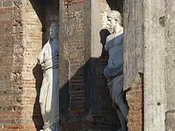 In the niches on the right are plaster casts (poor copies in the opinion of some archeologists[10]) of the two statues which were found here. The originals are now in the National Museum of Naples. They were erroneously believed to be likenesses of Marcellus and Octavia.[11] Marcellus was the patron of Pompeii, so the supposition was valid. The figures in the other niches were presumed to be Agrippina and Nero. Today they are believed to be two other as yet unidentified members of the imperial family.[12] Additionally, an arm with a globe in its hands was found here. It perhaps belonged to the statue of the emperor.[13]