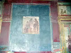 In addition, on the west side an example of the fourth style of Roman (so-called Pompeiian) decorative mural painting has been preserved. It apparently dates to the period after the great earthquake of 62 CE. Above the plinth are painted fields of black bordered in red. In the center of each, a mythological scene is depicted. In these Penelope recognizing the returned Odysseus, Io watched over by Argus, and Medea ruminating on the deaths of her children are recognizable. Between the individual panels are architectural vistas on a white background, with green and pale red buildings depicted in perspective.
