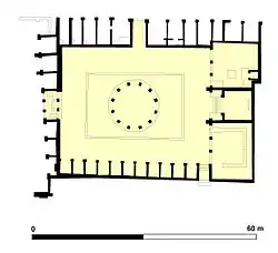 In the middle of the Macellum are the previously mentioned twelve column bases, which are made of tuff and arranged to define a dodecagonal space. They were initially thought to be remnants of a round shrine or tholos.[6] A well and pool would have been located within it. The rotunda was thought to have resembled other macella, perhaps the elaborate Eastern Greek and African models, or Roman examples such as that in Puteoli. However, Amedeo Maiuri's excavations clarified that the column bases and the space within them had a different function. As proven by the many fish bones and scales discovered in the drainage trough that flowed into the middle, the space was intended for selling fish. They were gutted and cleaned here.[7]
