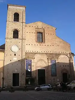 The Cathedral was built in 1459-1464 to designs by Cosimo Morelli; it underwent reconstruction in 1771. The façade and the adjacent square bell tower (1478), which projects forward into the piazza, remain unfinished in brick. The tower's design is attributed to Marino di Marco Cedrino.