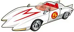 Mach Five is the racing car driven by "Speed Racer" ("Go Mifune" in the Japanese version), whose car was designed, manufactured, and created by "Pops Racer" (Daisuke Mifune), Speed Racer's father. The car is a two-seater, left-hand drive car with no detailed specifications other than that it is powered by a V12 engine.[7] The body is painted white and red with the letter "M" written on the hood.[b]