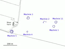 James Bryce listed five other antiquities to the west of the stone circles in 1861. Machrie Moor 6 (grid reference NR90733237) is the remains of a possible chambered cairn consisting of two touching upright stone slabs at right angles.[14] Machrie Moor 7 (grid reference NR90633253) is a standing stone 1.6 metres tall.[15] Machrie Moor 8 (grid reference NR90573237) is the remains of a probable chambered cairn comprising an oval spread of stones approximately 20 metres by 16 metres.[16] The most obvious feature is a 1.8 metre tall standing stone within the east edge of the cairn surrounded by several smaller stones which may have been part of a chamber or facade.[16] Machrie Moor 9 (grid reference NR905324) was a standing stone of which no obvious trace remains.[17] Machrie Moor 10 (grid reference NR90053265) is the Moss Farm Road Stone Circle.[18]