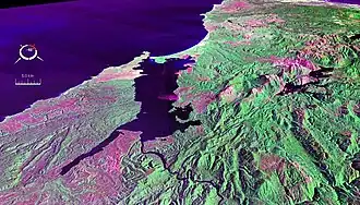 ![]() False colour Landsat image centred on Macquarie Harbour, looking northwest, draped over digital elevation model with x2 vertical exaggeration; screen capture from the NASA World Wind | |