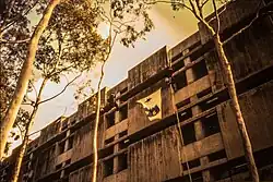The initial concept of the campus was to create a new high-technology corridor, similar to the area surrounding Stanford University in Palo Alto, California, the goal being to provide for interaction between industry and the new university.[17] The academic core was designed in the Brutalist style and developed by the town planner Walter Abraham who also oversaw the next 20 years of planning and development for the university. A committee appointed to advise the state government on the establishment of the new university at North Ryde nominated Abraham as the architect-planner. The fledgling Macquarie University Council decided that planning for the campus would be done within the university, rather than by consultants, and this led to the establishment of the architect-planners office.[18]