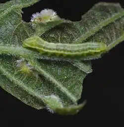 | Larva (top) and galls on red oak leaves (bottom) | |