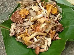 Indeed, the deep mycophily of Guatemalan indigenous people is apparent. Ethnomycological surveys conducted in the highlands, mainly through visits to local markets and interviews with vendors, revealed that some 130 species were identified as edible species, most of which actually sold in markets or along roadsides.[5][8][9] Species of edible mushrooms belonging to different genera (e.g., Amanita, Lactarius, Helvella) are often offered mixed together, and sold in form of 'medida', i.e. a fixed amount, which equals the content of a small basket. However, the more popular and valuable species are usually sold separately. Lactarius deliciosus and L. indigo – known as 'Shara' (or 'Xara') 'amarilla' and 'Shara' (or 'Xara') 'azul', respectively, or 'Cabeza de Xara' in local Spanish (Sharas, also known as 'urracas', are birds, variously coloured, living in different parts of the country) – Amanita caesarea complex (hongo de San Juan), and Cantharellus cibarius (anacate), are among the most appreciated edible mushrooms among Guatemalan Maya people. Daldinia fissa is recorded as a common edible ascomycete from the municipality of Tecpán, Department of Chimaltenango. The mushroom is named as "tzan tz'i" in Kaqchikel dialect, that means "dog nose " or "chucho nose" because of ascostroma shape.[10] Many, but by no means all, edible species are identified through common vernacular names that have been sometimes recorded in several Maya languages.[5] Generally, mushrooms are gathered and sold by women, often in family groups spanning three generations. Localities with more traditional knowledge, based on the number of species are used, were Tecpán (Chimaltenango) with 31 species, followed by San Juan Comalapa (Chimaltenango)and Totonicapán city (Totonicapán), with 22 species each. The collection of wild edible fungi is done throughout the year and the main forms used for marketing were the "medida", "unidad", "Libra" and "manojo", being subject to their species or group of species in question use.[11] The use of macrofungi in Guatemala other than for human consumption is limited to a few instances, such as for wound healing and for preventing infections (spores and dried mycelia of Calvatia lilacina and C. cyathiformis), cicatrizing substances to treat burns in children (sporocarps of Geastrum and Lycoperdon), to heal and disinfect wounds and to treat bee stings (dried specimens of Lycoperdon marginatum).[5]