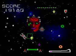 When reaching the third round, stranded astronauts and satellites are introduced and the former must be picked up with the edge of the paddle's reticle to rescue them.[2] Gathering enough astronauts with the reticle and delivering them to the satellites will give the player a power-up item that is picked up by either with the paddle itself or by shooting at it, granting the ability to launch the paddle as a slingshot. However, if the player keeps gathering enough astronauts but does not deliver them to the satellites will increase the paddle's firepower and when powered up, it will grant the ability to shoot lasers. Powering up is also the only way to restore the paddle back to normal but if the player touches the astronauts with the paddle, however, they will be pushed off-screen. At the end of the fifth and tenth rounds, a boss is introduced and the player must rebound their orange projectiles two times in a row to turn them purple in order to deal damage at the boss, while their pattern becomes more erratic as they take more damage during the fight.