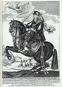 She was born at the Château de Neuville-en-Verdunois,[1] then in the Duchy of Bar. She was the daughter of Simon d'Ernécourt and his wife Marguerite Housse de Watronville. The family had made their fortune in the leather trade,[2] and Alberte was sole heir after the early death of her brother Nicolas. She was brought up mostly by her father's sister, Barbe d'Ernecourt at the Château d'Étrepy. In 1623, she was given in marriage to Jean-Jacques de Haraucourt, lord of Saint-Baslemont, who was an infantry commander in the service of Charles IV, Duke of Lorraine.