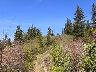 The Maddron Bald Trail is an American hiking trail in the Great Smoky Mountains National Park of Cocke County, Tennessee. Rising from the outskirts of the Cosby community, the trail ascends Maddron Bald, a 5,212-foot (1,589 m) mountain crowned by one of the park's most substantial heath balds. The trail also provides access to Albright Grove, a patch of old growth hardwood forest that contains some of the oldest and tallest trees in the Smokies.[1] The Maddron Bald Trail's terminus— at its junction with the Snake Den Ridge Trail— is just 0.7 miles (1.1 km) from the Appalachian Trail.